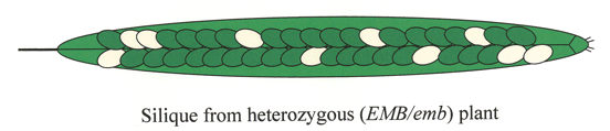 Identifying Heterozygotes: The most common misconception about embryo-lethal mutants is that they cannot be studied or maintained. This is simply incorrect. Recessive mutants are readily maintained as heterozygotes that appear normal but produce 25% defective seeds following self-pollination. Mutant seeds can be removed from immature siliques and subjected to a variety of descriptive and experimental studies. Mutant seeds can be distinguished from unfertilized ovules and normal seeds before and after desiccation. Click here for additional images of mutant and wild-type seeds and embryos observed under a dissecting microscope. If you are exploring a reverse genetic strategy with T-DNA or transposon insertion lines and you cannot identify a homozygote in a line of interest, one possibility is that all of the homozygotes died as embryos. This can be confirmed by demonstrating that all plants heterozygous for the insert produce siliques with about 25% defective seeds. A few mutants are known that produce 50% defective seeds following pollination of heterozygotes, even when the pollen comes from a wild-type plant. In these cases, either the wild-type allele contributed by the male is silenced early in seed development, or a specific defect in megagametophyte development becomes limiting after fertilization.