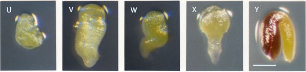 Unfertilized ovules on left, mutant seeds in center, wild-type seeds on right.