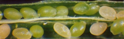 The seeds of Arabidopsis are produced in fruits known as siliques. Before fertilization, the silique is called the ovary and the seeds are called ovules. Each silique contains two carpels, a central replum, and two long rows of seeds that are attached to the replum through a funiculus. The funiculus guides the pollen tube during fertilization and provides a pipeline for nutrients from the maternal plant. A typical silique produced under optimal conditions contains 40-60 seeds. Click here for a simplified drawing of an immature silique. The number of viable seeds at maturity is determined by the number of ovules produced, the percentage of ovules fertilized, and the frequency of seed abortion. Vigorous plants often produce flowers with about 60 ovules. Most siliques contain at least a few unfertilized ovules resulting primarily from incomplete transfer of pollen to the stigma surface. The frequency of spontaneous seed abortion is influenced by growth conditions but is often less than 1% of fertilized ovules. Distinguishing between unfertilized ovules, mutant seeds, and spontaneously aborted seeds is an important feature of working with embryo-defective mutants.